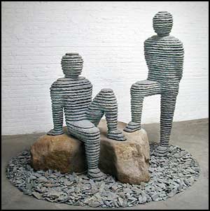 For this mini-retrospective, the artist has assembled a cast of characters - three life-size tableaux and more than ten maquettes on pedestals - evoking both a puppet-maker's workshop and an Egyptian tomb. In Asaf & Yo'ah (2001), two figures seem to rest against a boulder atop a circle of chipped rocks. Posed as if for a photograph, yet faceless, they simultaneously appear to be earthly beings and universal symbols of humanity. Nearby, two smaller works on pedestals - Yig'al & Amaya (1999) and Ge'w'el & Binyamin (2002) - present variations on this idea. Despite their apparent stony stoicism, they have a quirky, humerous appeal: their rounded forms and lack of distinct features reacal the anonymous figures on bathroom or street signs.